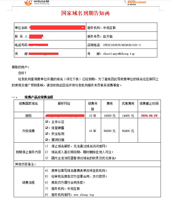 提醒廣大客戶警惕中拓互聯國家域名到期續費套路